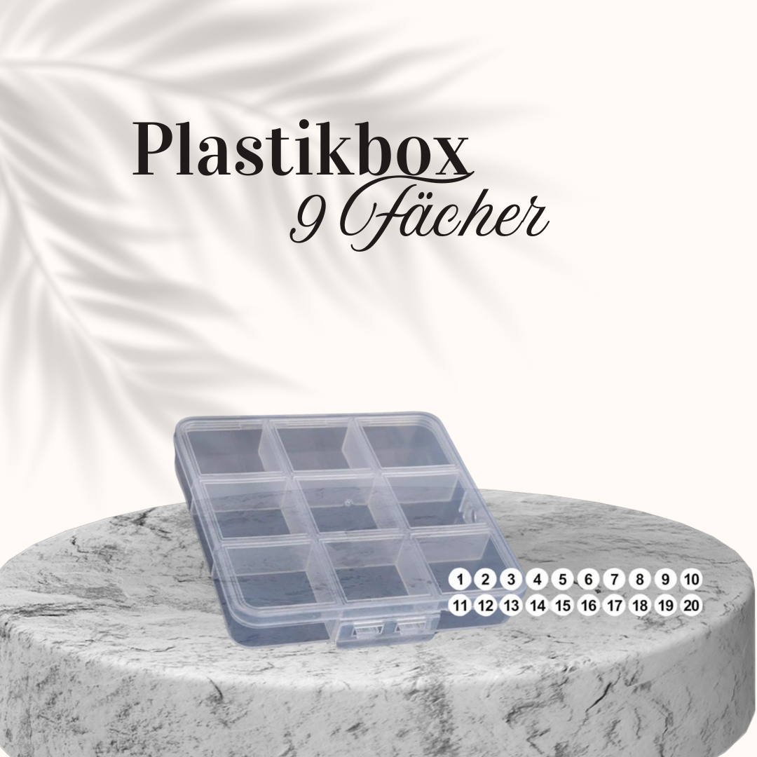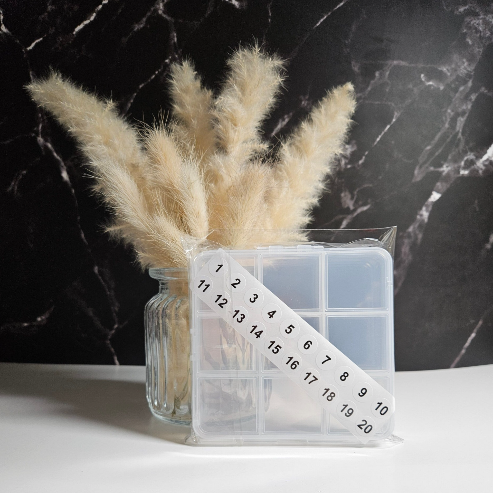 Plastikbox mit 9 oder 12 Fächern – ideal zur Aufbewahrung von losen Wimpernfächern. Inklusive Nummern-Sticker zur Kennzeichnung der gewünschten Längen für eine übersichtliche Organisation